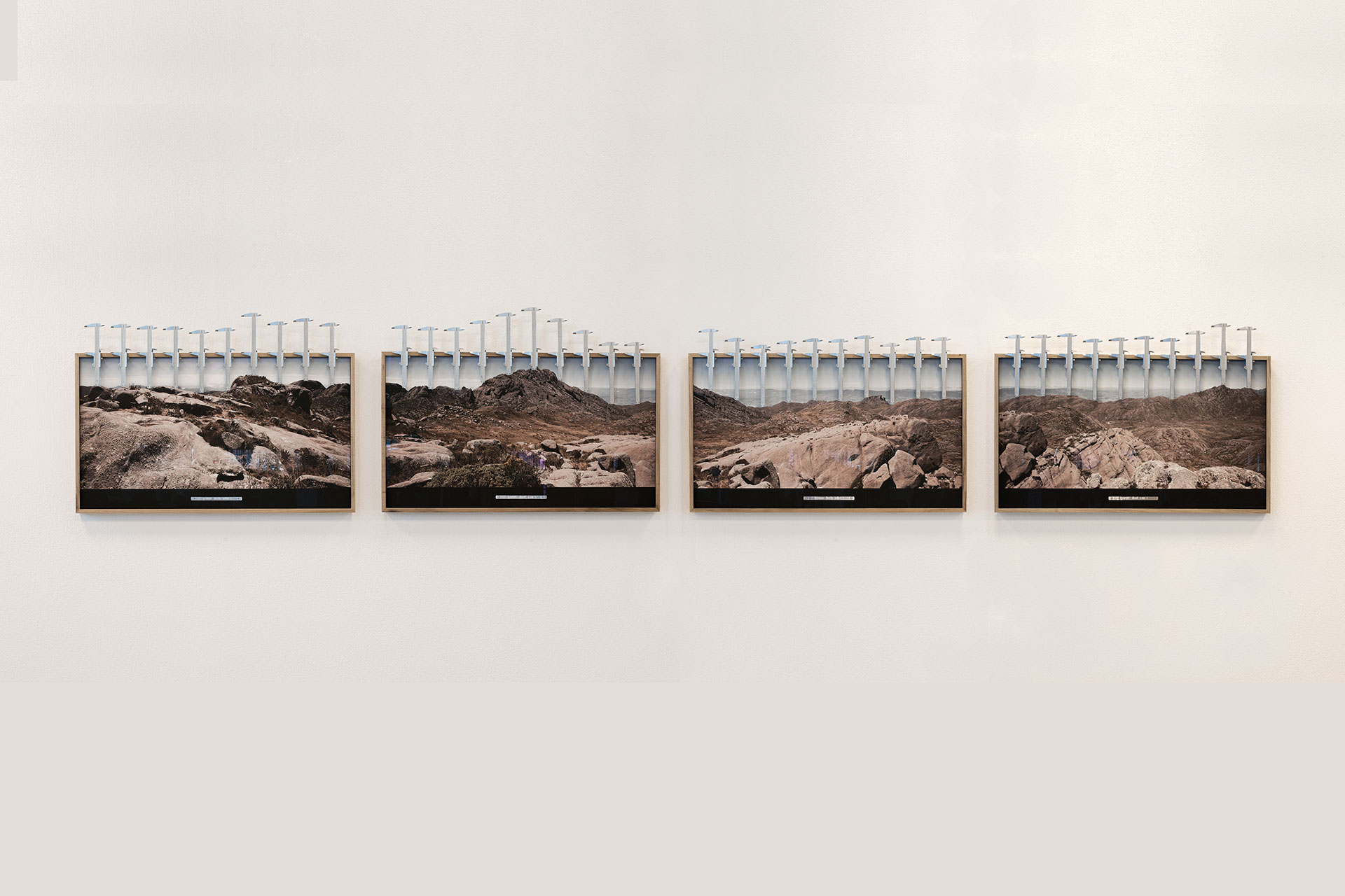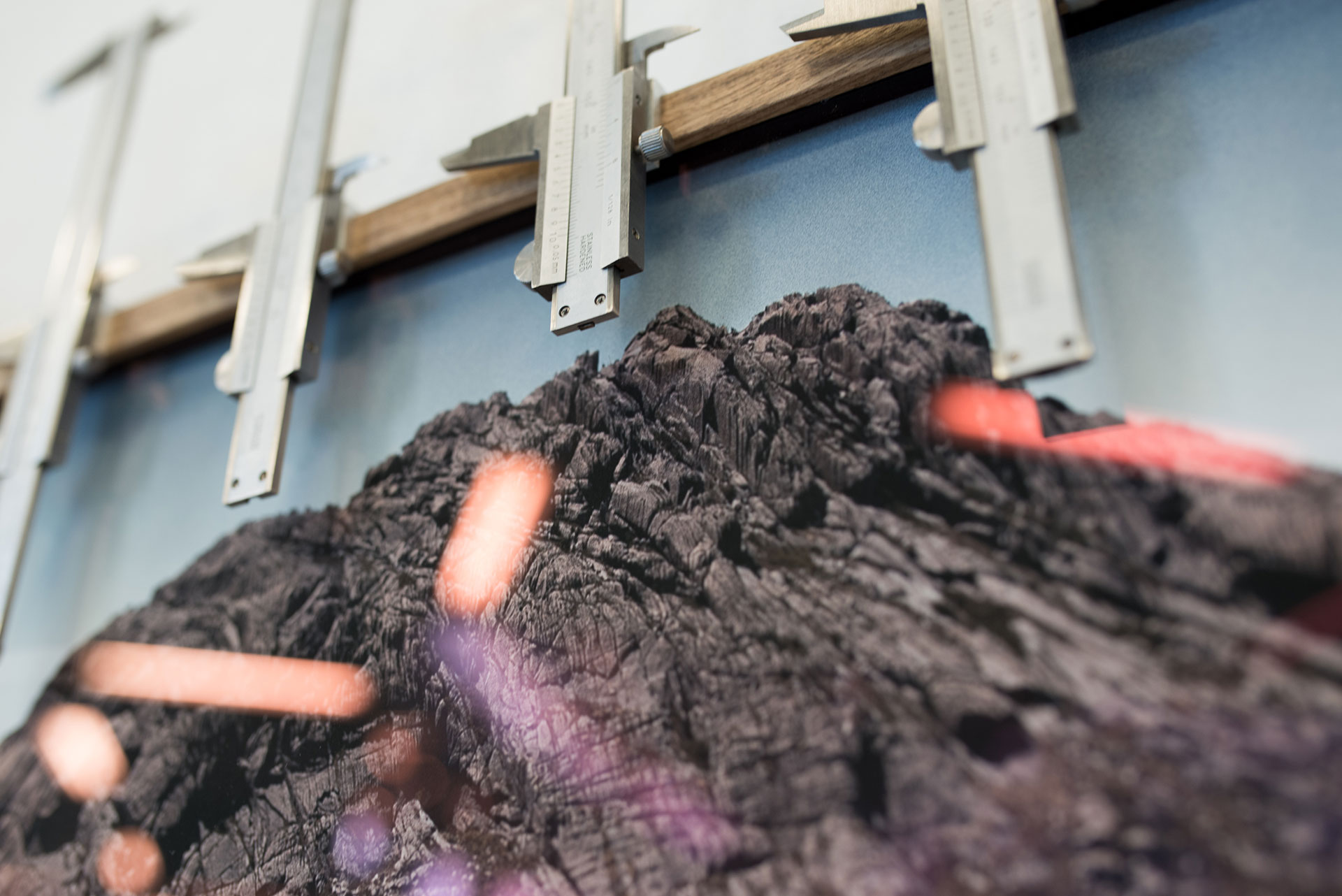 Sobre cada moldura 10 paquímetros fazem uma leitura da linha do horizonte do Parque Nacional do Itatiaia, transportando para fora da moldura o relevo do terreno. O horizonte, lido por instrumentos utilizados para uma aferição de precisão micrométrica torna-se totalmente esquadrinhado em seus mínimos detalhes.