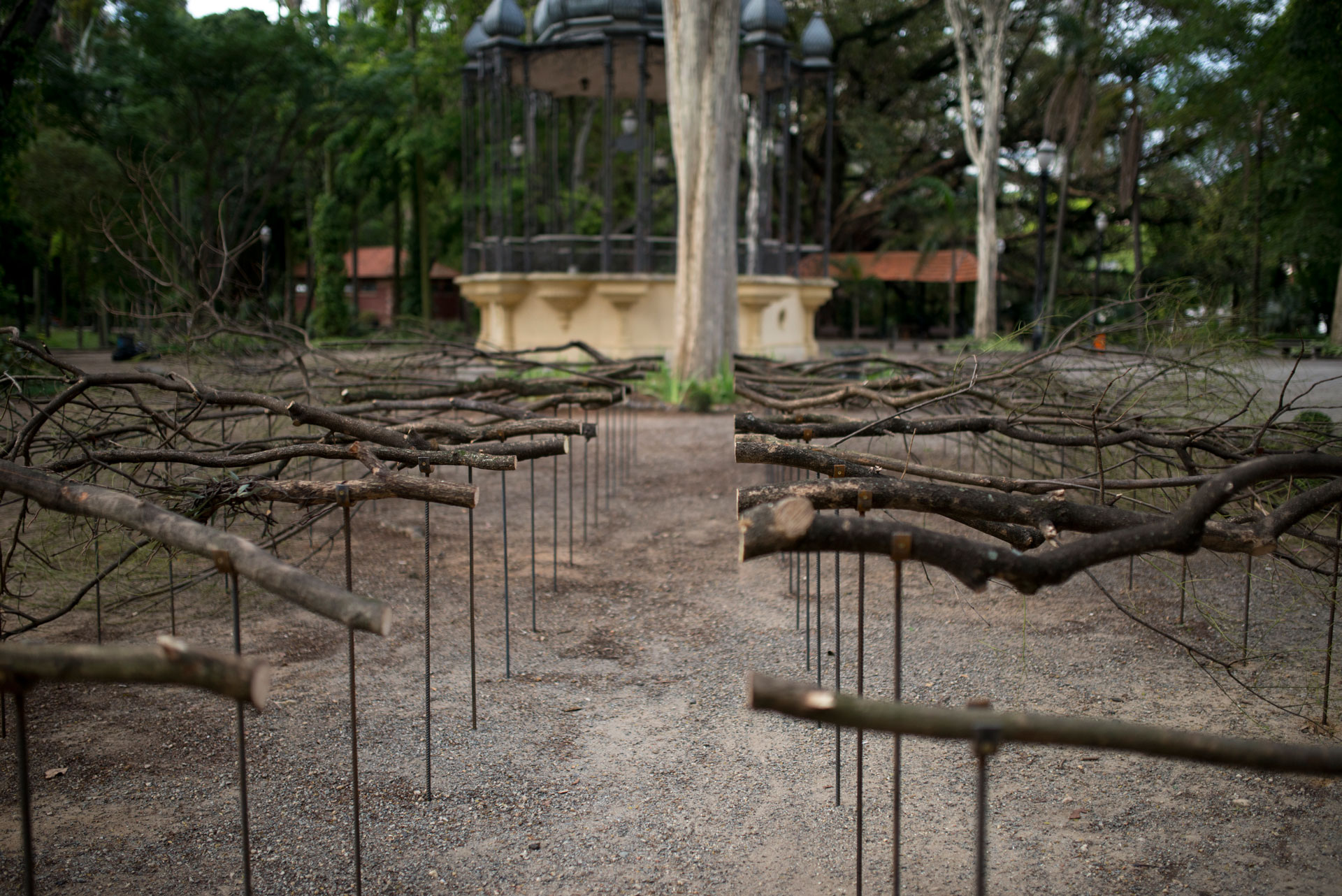 The intervention performed in Portugal Embassy in Brasília (2021) and also at Parque da Luz in São Paulo (2014), with dry branches and iron sticks, creates a "corridor" that can be seen in the gap between the two sides, a garden tree.