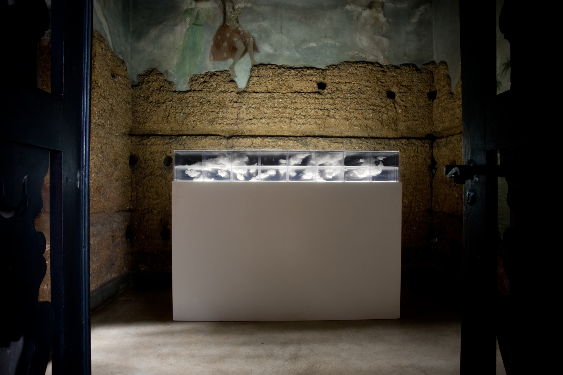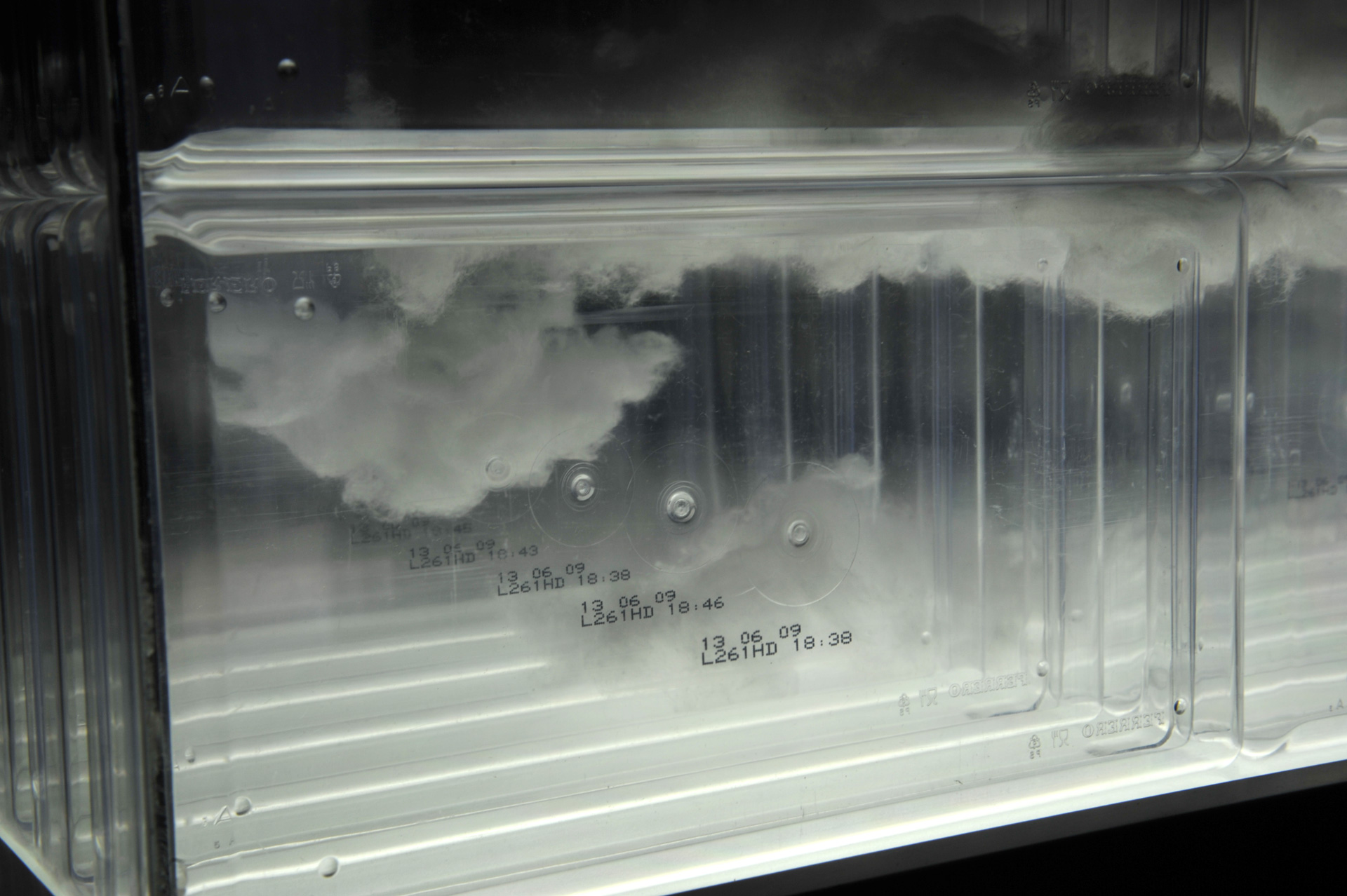 The banal everyday elements are by this way transfigured in sublime objects, delicate and fragile. The polystyrene boxes serve to divide the place from the fake sky, in a space section which contains each piece of cloud. They still have the numeric codes of the production batches which are taken as geographical coordinates from determined space and help in the attempt of special projection of the object/cloud.