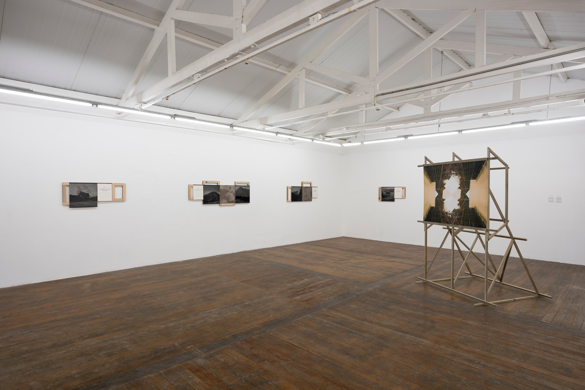 The series that lends it title to the exhibition, The Natural History and Other Ruins, 2018, is composed of fragments of an encyclopedia from the 1970s describing the formation of the earth and the development of life on the planet. Entitled chapters (chapter 1, chapter 3, etc.), the works are organized in compositions of parts of the encyclopedia with photolytic images of a mining industry sided with sheets of oxidized steel which textures resemble the rocky mountain landscapes of the mining company. The suggestive titles of the Chapters in this series are evident in the compositions: "Evolution of the Species," "Domesticated Nature," "A Laboratory of Evolution."